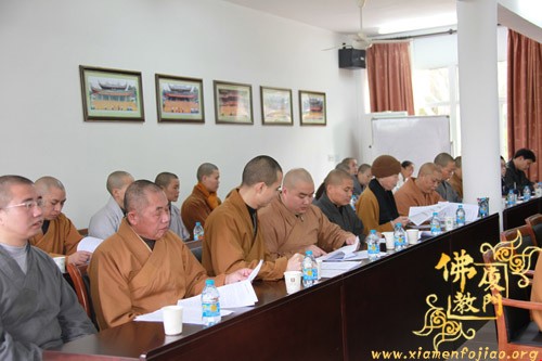 会上,沈仲勇调研员、定恒法师、净心法师等传达了全省六厅局《关于落实宗教教职人员社会保障工作的通知》(闽民宗[2011]17号),《关于推进宗教教职人员参加养老保险有关问题的通知》(闽人社文[2011]80号)等文件,以南普陀寺常住、闽南佛学院及慈善会办理社保实例参考草案。对厦门市佛教教职人员社保问题做了具体调查并总结出具体做法,市民宗局就我市佛教教职人员参加社保有关问题做了解答。