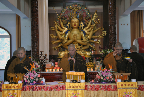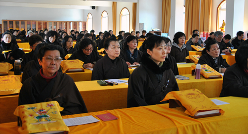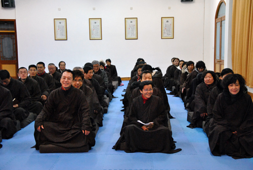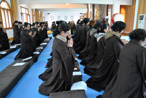 3月27日早上6点30分开始,正式为居士们授三皈,五戒、菩萨戒。 (中)学院院长了藏法师为尼和尚,(左)副院长显德法师教授阿舍梨,(右)教务长法印法师为羯磨阿舍梨。