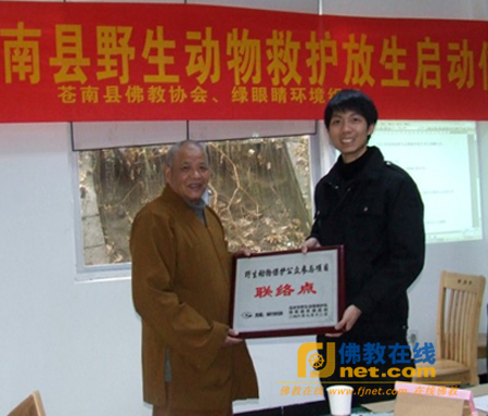 2011年3月6日下午,由浙江省温州市苍南县佛教协会资助,温州市绿眼睛环境组织主办的“2011年苍南县民间野生动物救护放生启动仪式”在苍南县举行。启动仪式上,苍南县佛教协会会长觉圆法师代表苍南佛教协会与绿眼睛签署合作备忘录,表示苍南佛协愿无偿资助绿眼睛开展野生动物救护放生工作,并与绿眼睛达成长期合作意向。