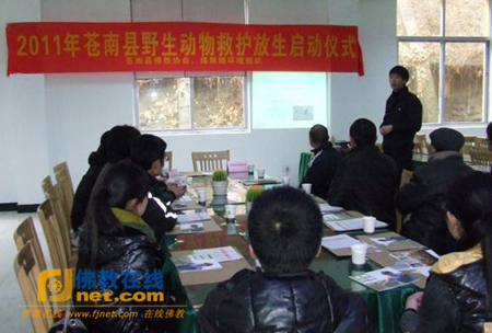 在启动仪式上,绿眼睛创办人、理事长方明和采用多媒体投影方式,向与会人员宣传野生动物保护理念,讲述绿眼睛为保护野生动物所做的贡献。当天,绿眼睛志愿者代表、苍南佛协人员,及关心野生动物保护的社会人士参加仪式。此活动旨在野生动物救助与保护,呼吁公众提高野生动物救助与保护意识。