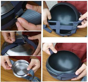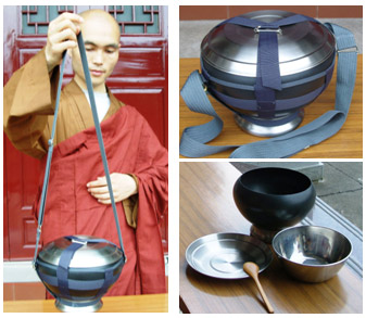 钵络、钵囊:乞食时各自作钵络盛钵自持之。若手执难持,作囊盛系口带络肩上,钵挟掖下钵口外向。《善见》:钵袋串左肩青色。