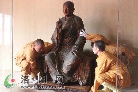几分钟后,四名工作人员稳稳地托起罗汉的底座,将其抬起,并慢慢移动到三尊主佛前,白马寺方丈印乐法师和众法师集体跪拜在佛像前,向佛像行大礼。