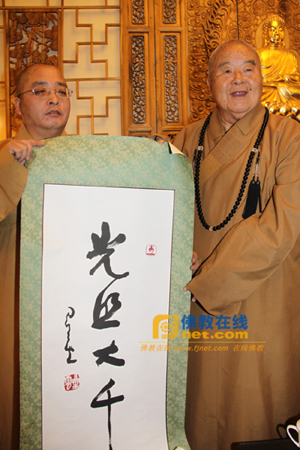 星云大师向圆持法师赠送了自己的书法作品