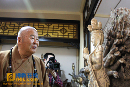 会见结束后,星云大师在圆持法师的陪同下参观了中国佛教图书文物馆。圆持法师为星云大师逐一介绍了馆藏的珍贵佛教文物,包括各类不同历史时期的佛像、法器、卷轴。星云大师对图文馆丰富的馆藏表示由衷的赞许,并叮嘱一定要继续妥善保存。参观结束前,圆持法师请出了馆中珍藏的一卷长约9米的珍贵卷轴——北宋开宝藏《大般若波罗蜜多经卷》,星云大师虔诚合掌,细细观瞻,兴趣盎然。