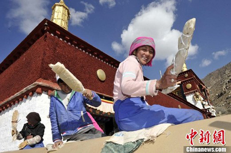 4月15日,工作人员在已有600多年历史的藏传佛教格鲁派著名寺庙哲蚌寺屋顶上砌筑女儿墙