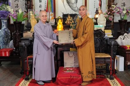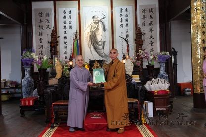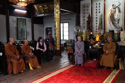 2011年4月26日,台湾法相山文教基金会参访团一行11人在慈智法师的带领下,前来浙江宁波天童寺参学交流,天童寺方丈诚信法师在大鉴堂热情接待了大家。