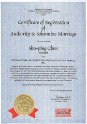 菲律宾佛光山万年寺办佛化婚礼和结婚登记,于2011年度获当地政府和国家统计局认可,这是菲律宾第一个佛教道场办结婚登记获菲律宾政府颁许可证的寺院。