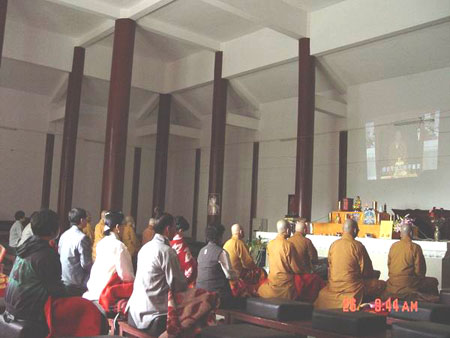 26日早斋后,延和法师一行到六祖寺教育学修中心禅堂参禅2小时,聆听大愿法师的内观禅修开示,随后应随行居士祈请,与居士们共同顶礼大愿法师,主法供养上堂斋。