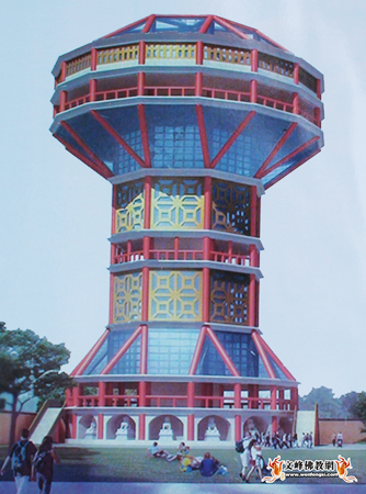 近日,江苏省扬州市高旻寺隆重举行“钟之巅”奠基大典。“钟之巅”为十六角等边腰鼓形建筑,底座直径为三十米,上端直径为三十六米,搞五十八米,最上层悬挂一口宝钟,重10吨。