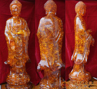 浙江台州发现大型琥珀佛像,该佛像为释迦摩尼佛立像。佛像高93厘米,重28千克,为目前国内琥珀佛像之最。该物象造型丰满,工艺精美,面相庄重慈祥,衣纹流畅飘逸,栩栩如生。具有高度的艺术感染力,没有宗教信仰的热情和力量,就不会有如此完美的佛教艺术品产生。