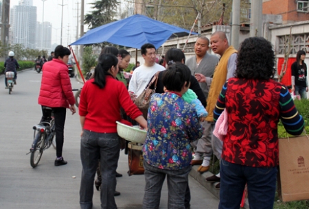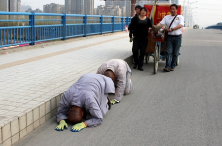 安徽讯 安徽九华山甘露寺智远法师和含亮法师为朝拜山西五台山五方文殊菩萨,从九华山甘露寺到五台山黛螺顶,有1800多公里的路程,三步一拜叩拜朝礼,要“走”上半年时间。2011年4月9日,智远法师和含亮法师已叩拜朝礼至安徽合肥市,并从合肥潜山路最南端出发,一路往北,后经淮南、寿县、毛集实验区、阜阳、亳州,河南商丘、开封、郑州、原阳、新乡、淇县、安阳,河北磁县、邯郸、永年、沙河、石家庄、正定、新乐、行唐、阜平,最后抵达山西五台山。