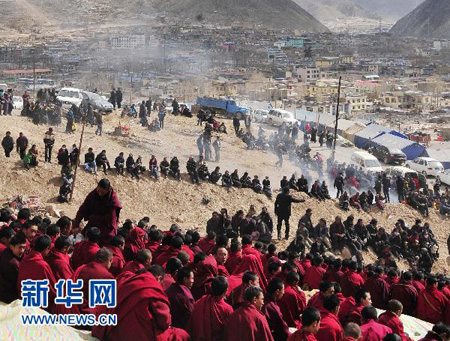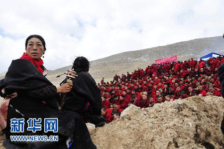 14日10时,三个寺院的900名僧人齐聚结古镇东德隆钦山下的扎西大同天葬台,集体诵经。该地曾于2010年4月17日集体火葬近千名地震遇难者遗体。