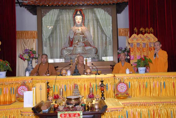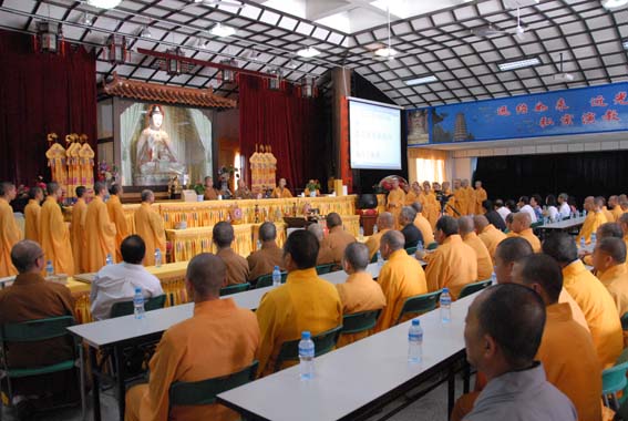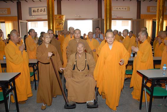 星云大师一行在陕西省佛教协会会长增勤法师与秘书长刘进业先生的陪同下,于上午10点30分抵达法门寺。此时,法门寺监院、佛学院副院长智超法师以及法门寺佛学院常务副院长贤空法师已经率领四众弟子在山门前恭迎。双方见面后亲切握手,合掌问候。在钟鼓齐鸣的梵音慈护下,在四众弟子的夹道欢迎下,星云大师经由大雄宝殿来到法堂。整个法堂内座无虚席,四众弟子近二百人聆听了大师的开示。
