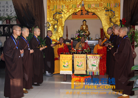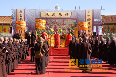 上午八时,众戒子早早恭候在新戒堂,戒子们都怀着殷切的心情、高声念诵着佛号迎请三师,至诚请戒,礼请得戒和尚妙江法师为自己授沙弥十戒。