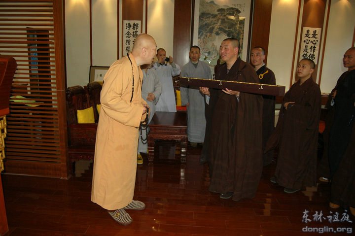 开示结束后灵岩山佛学院参访团妙圣法师向我寺敬赠礼物