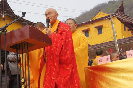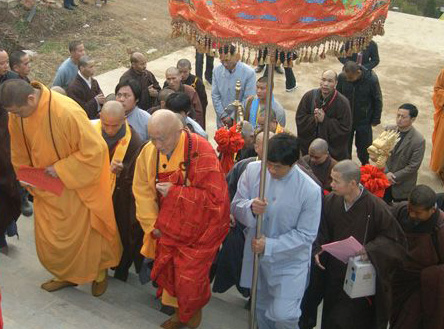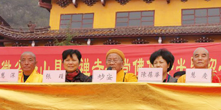 10时许,在天王殿前举行了热烈隆重的庆典大会。省市领导以及各诸山长老纷纷致贺词,妙安长老也为大会作了慈悲开示。