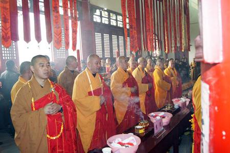 庆典法会于上午7时正式开始,褒禅寺监院率仪仗队行至山门外的香案前,拈香三拜,长跪合掌,祈请绍云长老慈悲晋院。绍云长老默许,在仪仗队的引领与众人的簇拥下缓缓前行。参加庆典活动的全体嘉宾肃立两旁,向绍云长老致以庄严敬礼。