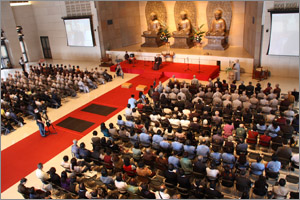 为聆听一行禅师弘法讲演,法鼓山园区大殿五百多个座位区座无虚席,大家仔细聆听其智慧开示,并让自己的心灵获得更多正念滋养。