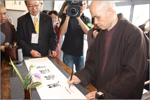 一行禅师现场挥毫写下‘圣德端严’四字赠予法鼓山