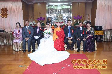 国际佛光会北市北六区督导长张明芬三公子张道文先生与林嘉慧小姐,4 月12日下午於大慈佛社举办佛化婚礼,礼请台北道场住持觉元法师为新人福证,在