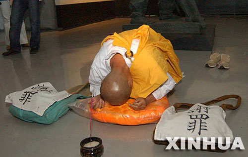资料图片:2006年5月11日,日本僧人岩田隆造在哈尔滨侵华日军第七三一部队罪证陈列馆的活体试验展厅为侵华日军的当年恶行谢罪。王茜 摄