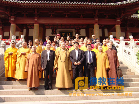 毗卢寺方丈传义法师陪同诸位领导参观了该寺大雄宝殿、万佛楼等处,双方并进行了亲切交谈,传义法师向诸位领导赠送了墨宝。最后大家在万佛楼法堂前合影留念。(毗卢寺供稿)