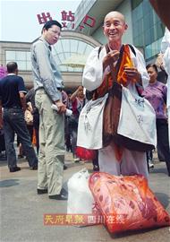 成都火车北站出站口,身着僧袍,背着“谢罪”字样挎包的岩田隆造一出现