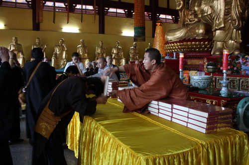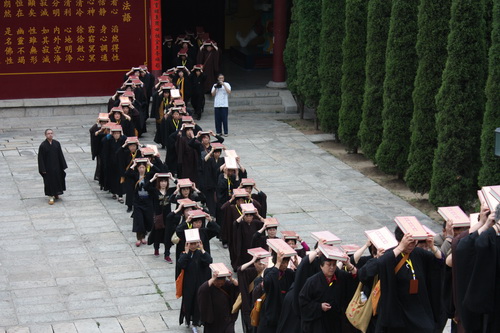5月14日上午,本寺两序大众举行仪式,隆重迎请老天福禅寺赠送的《永乐北藏》入寺供奉。