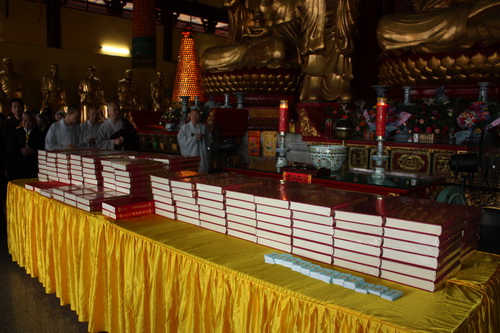 《永乐北藏》又名《北藏》,为官版,明成祖永乐八年(1410年)敕令雕印,始刻于明成祖永乐十七年(1419年),完成于英宗正统五年(1440年)。老天福禅寺所赠新版《永乐北藏》全套200册,精装大16开本,封面采用高档细布彩印技术精装烫金,内文印刷清晰,整套藏经庄严精美。