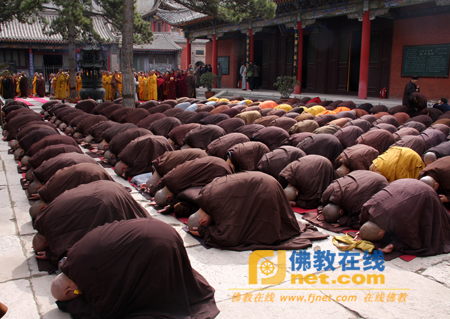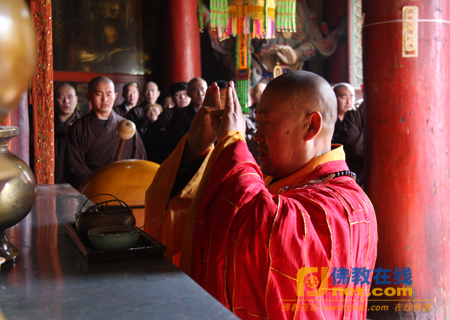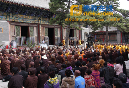 上午8时许,碧山寺钟磬共鸣,五台山全山普佛法会在碧山寺雷音大殿内隆重举行。妙江法师在两序大众虔诚礼拜、佛号念诵声中被迎请至雷音大殿,在大殿内拈香主法。大殿内外,千余名僧众按照仪轨,齐诵佛菩萨名号、顶礼十方三世诸佛,并以此功德回向十方法界众生,共同祈祝正法住世、法轮常转;祈愿世界和平、灾劫平息、社会和谐、国泰民安。