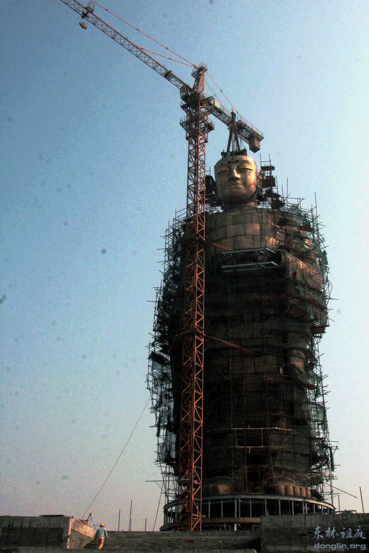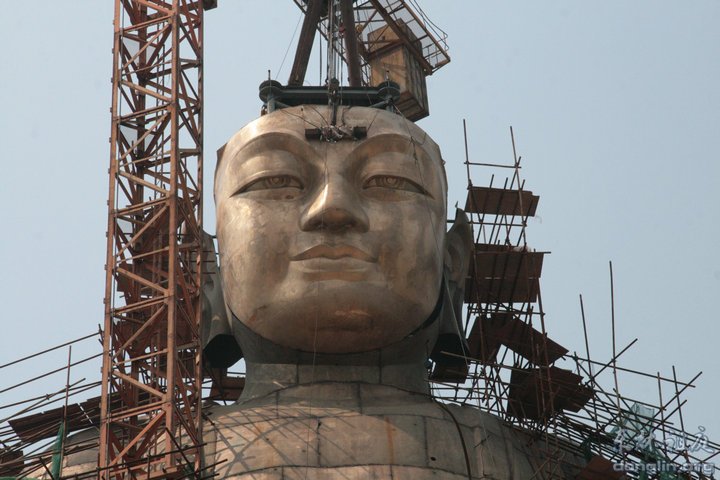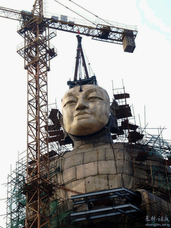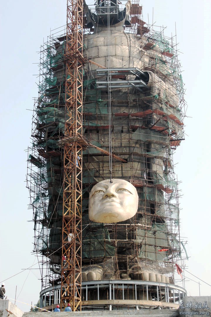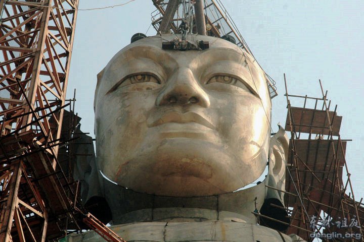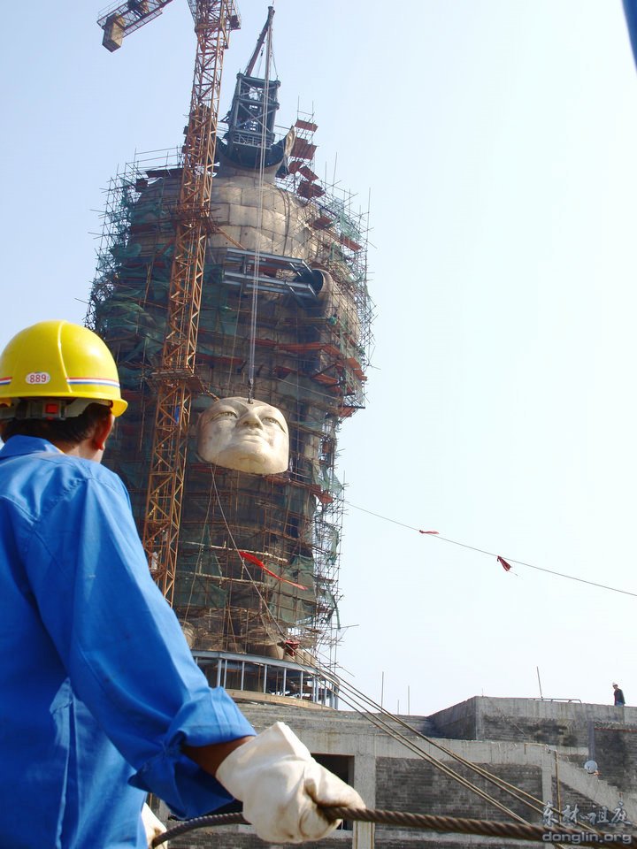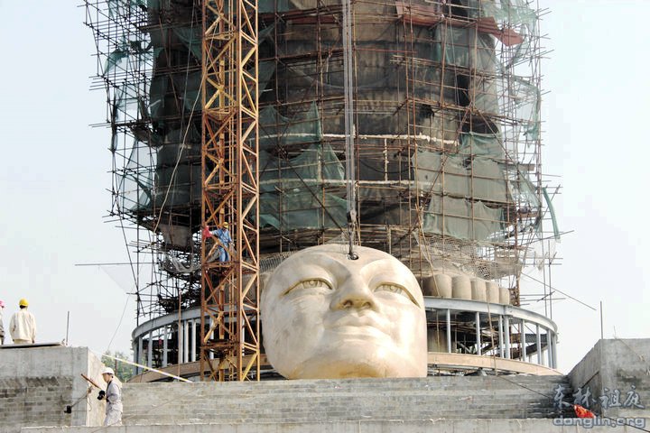 5月26日的东林大佛建设工地现场:起吊安装之前的东林大佛佛首面部(佛面总重达11吨)