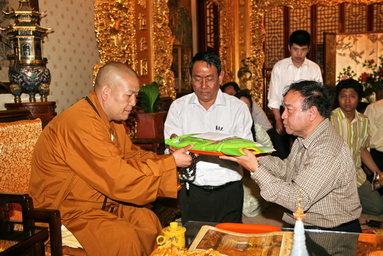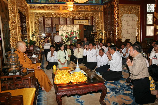 缅甸驻华武官带领缅甸在中国的留学生100余人前来灵光寺参拜佛牙舍利。灵光寺方丈常藏大和尚热情接待了缅甸的留学生。
