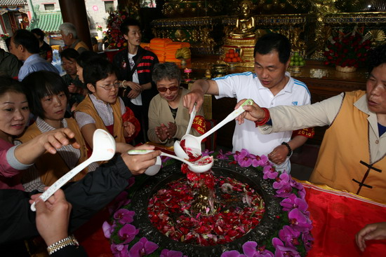 8:30分,灵光寺佛乐团及法师迎请方丈大和尚至舍利塔前;法师唱诵经赞,方丈大和尚吉语施众后,“浴佛节”正式开始。信众鲜花、圣水灌沐“太子像”,也沐浴着每位佛子的心。