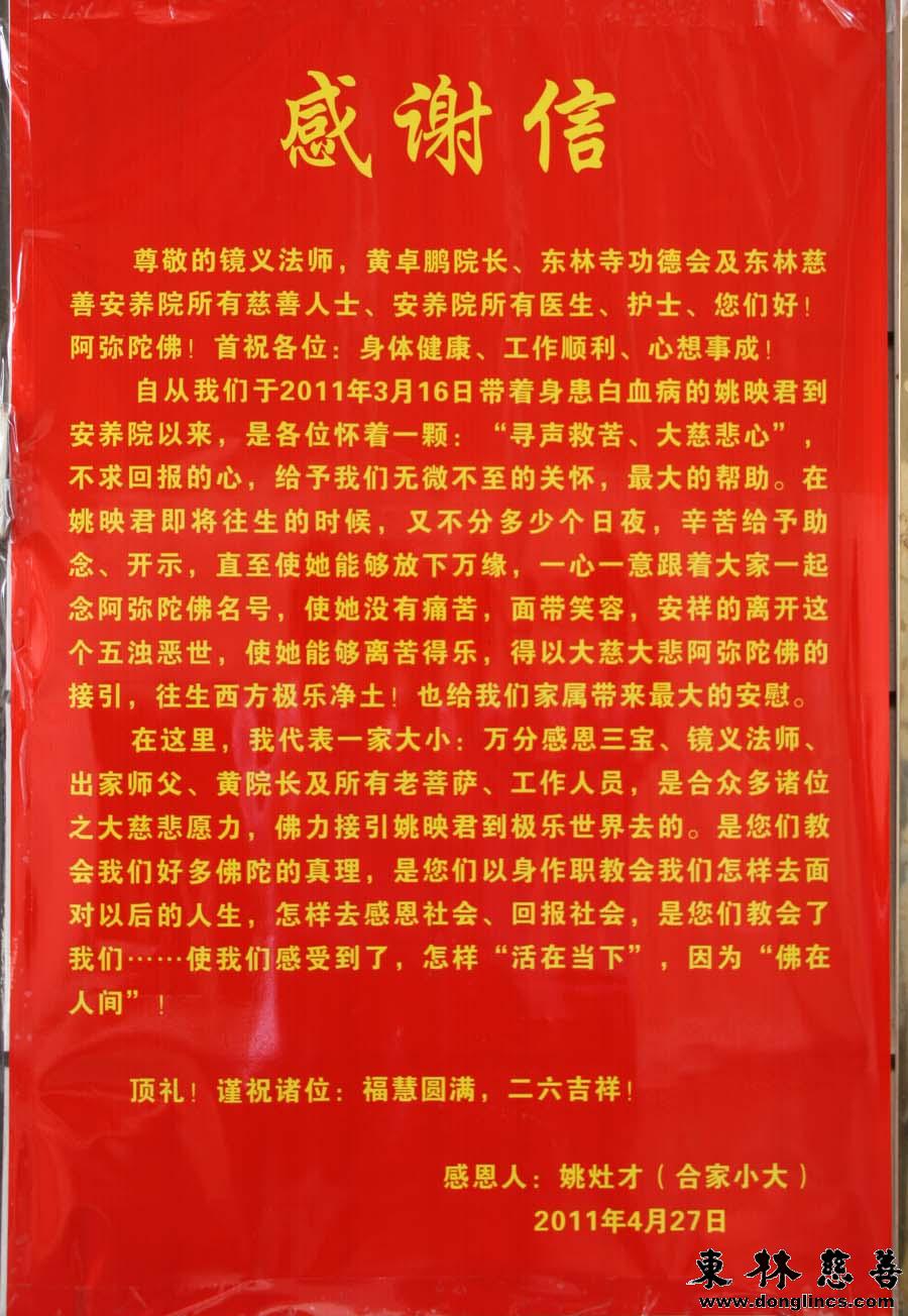 对于安养院以及功德会所有莲友给予小映君的所有关怀,家属表示非常满意和感动,自述说:如果当初把小映君带回家去的话,真到她往生的时候,我们一定会束手无策不知道该怎么办,还好在安养院这里,一切都有莲友们去安排办理,一切都做得如理如法,细心周到,正是有了莲友们真诚无私地关怀和帮助,姚映君才会走得那么安详舒适;我们以前虽然也信佛,但是对于佛法了解得并不深,来东林慈善后才真正懂得了什么是佛法,这边的佛弟子们用自己的践行向我们阐释了什么叫“弥陀的使者”,什么叫“千人伸出千手化作无数的观音菩萨”!我们发愿以后一定要毕生行善,要像东林慈善的这些佛子们一样,去做观世音菩萨的一只眼一只手,帮助那些在生死苦海中沉沦挣扎的人们! (念佛人/文)