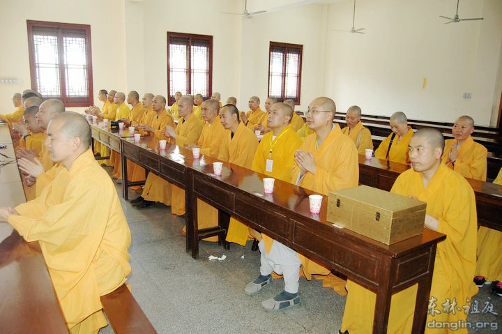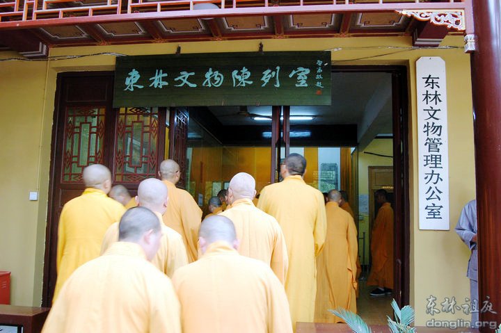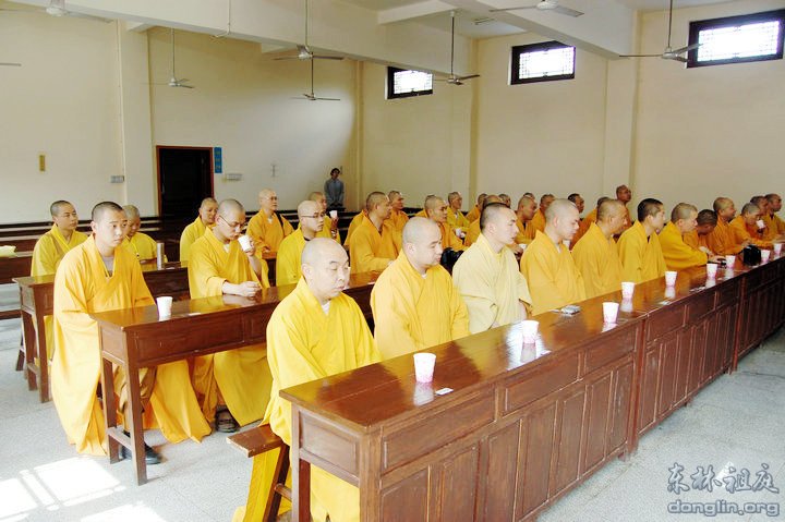 观光之后,道元法师请参访团一行到五观堂喝茶,稍事休息。道元法师说,目前东林寺正举办五一精进佛七法会,有3000多名四众弟子在寺院7个殿堂经行念佛,各位法师、居士不能上大雄宝殿上香礼佛,深表歉意。