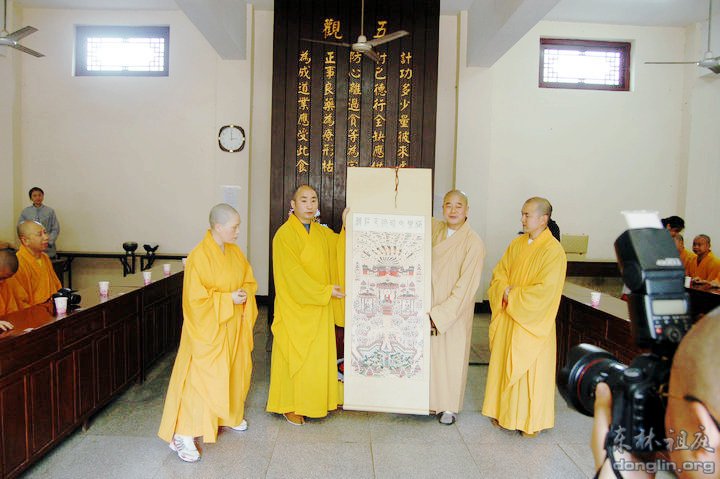 在热烈的掌声之后,心定法师代表峨眉山佛协参访团一行,向东林寺赠送了一尊普贤菩萨像,并供斋一万元。道元法师代表东林寺向峨眉山佛教协会赠送了一幅精美的《西方极乐世界图》。