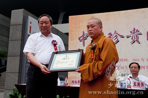 2011年5月18日,由国家文化部、国家中医药管理局主办,国家图书馆(国家古籍保护中心)、中国中医科学院(全国中医行业古籍保护中心)承办的“中华珍贵医药典籍展”在北京国家图书馆隆重开幕,释永信方丈应邀参加了开幕仪式。本次展览全面展示了新中国成立以来,特别是近年来中医古籍保护工作成果,系统地体现了中医理论体系的发展脉络。展览共展陈90余种中医药善本古籍、60余件药具实物及多种药物标本。