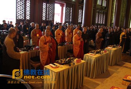 大雄宝殿内,木鱼声响,佛磬低和,众僧齐声诵经。宝殿之上,佛祖释迦牟尼佛、东方药师佛、西方阿弥陀佛黄布遮面、高大庄严,大殿四壁雕刻有各地的各样佛塔,精妙绝伦。主礼梦参长老、净慧长老、妙江法师持毛巾向佛像做拂尘动作,镜显众生之时,朱砂笔点向佛眼。主礼各位长老高呼一声:“开!”顿时殿堂佛乐大作,香火袅袅,熠熠生辉,佛光普照。诸山长老及大德法师同为开光主法,大殿内法会庄严肃穆,圣烟缭绕;众信奉三拜九请,虔诚顶礼,共沐佛光。