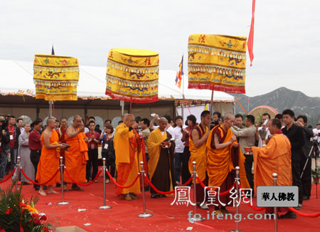 中国佛教协会副会长、西双版纳州佛教协会会长祜巴龙庄勐长老,青海塔尔寺住持宗康仁波切,杨州高旻寺老堂主彻明长老为云居寺佛祖真身舍利曙陀罗宝塔奠基圣典主礼并绕坛城洒净水、谷米、宝石。(图片来源:凤凰网华人佛教 摄影:李保华)