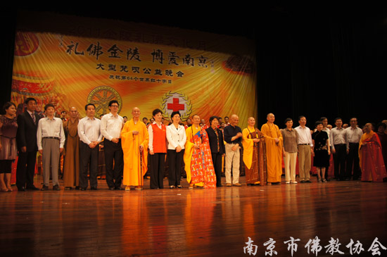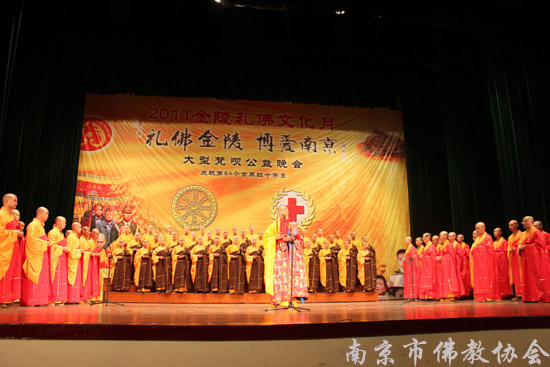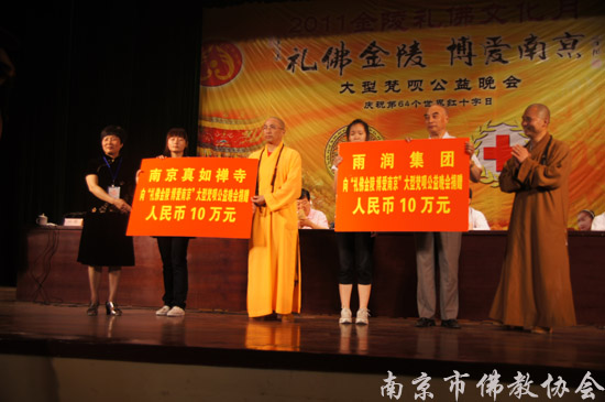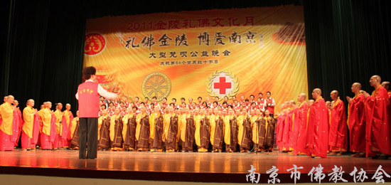 为更好的弘扬“人道、博爱、普济”精神,打造南京世界“佛都”形象,5月8日19时由南京市佛教协会、南京市红十字会共同举办的“礼佛金陵•博爱南京”大型梵呗公益晚会在南京人民大会堂隆重举行。此次公益晚会在南京真如禅寺、雨润集团、南京电视台等单位的赞助下,募集善款30万元,用于对100名残疾人,100名贫困户、100名贫困学生的捐助。