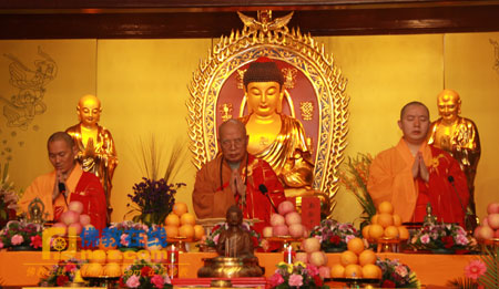 传印长老(中)为传戒和尚,容通法师(右)为羯摩阿阇黎,觉灯法师(左)为教授阿阇黎