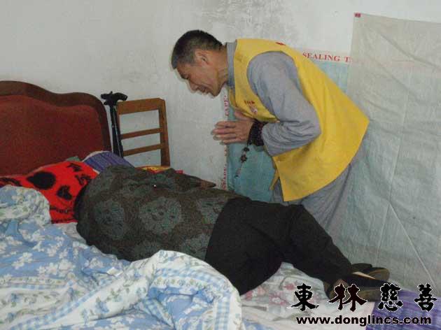 傅师兄渐渐体会到慈悲的力量。双下肢瘫痪的陈国权是东林慈善功德会从2008年至今的长期关怀对象。他有两个读小学的孩子,打水做饭洗衣服都是由弱小的孩子完成。当时,陈国权已经在家卧床一年了,夏天也要穿棉鞋、棉袄。对自己的命运,他抱有很大的怨恨心。每次居家关怀时,傅师兄和其他志愿者们都会告诉他,是佛菩萨送温暖来了,是东林寺关怀他来了。在这种慈悲心的感召下,陈国权开始愿意听闻佛法,对菩萨充满感恩之情,并精进念佛。2009年,陈国权已经可以拄拐从四楼走到一楼了。见到此景,傅师兄不禁感恩赞叹道:“这都是佛菩萨的加持啊,看看念佛的力量是多么殊胜。这些因果都告诉我们,要处处升起慈悲心,精进学佛,佛菩萨的加持力真实不虚啊!”