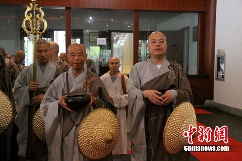 在杭州市佛协会长光泉法师、副会长定本方丈等的带领下,杭州市属寺院和佛学院近300名僧人托钵行脚。沈兰 摄