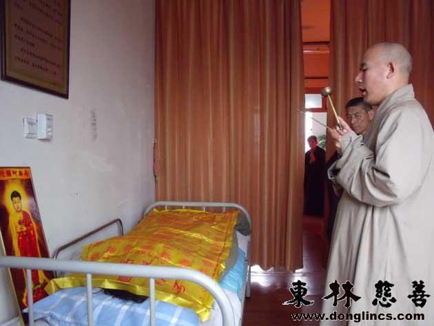 进入助念室:经临终确认后,大众迅速把她抬到助念室往生床上。