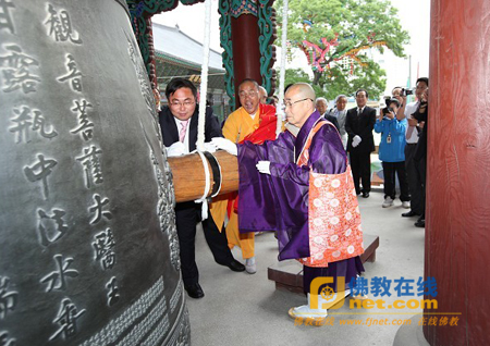 中韩日三国与会代表共撞和平钟,为日本大地震受难者祈福