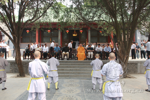 会谈结束后,释永信方丈陪同巴罗依外长观看了少林僧人展示的少林功夫,并与武僧合影留念。