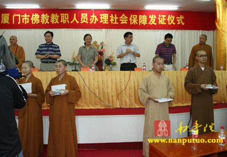 根据《关于落实我市宗教教职人员社会保障工作的通知》(厦民宗[2011]25号文)要求,为贯彻落实福建厦门市宗教教职人员的参保缴费工作,厦门南普陀寺于2011年6月8日在该寺讲堂隆重举行“厦门佛教教职人员办理社会保障发证仪式”。