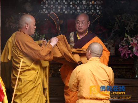 普佛法会期间,塔院寺还隆重举行了临济正宗传法法会。在庄严的“香赞”梵音中,塔院寺法主照慧法师拈香升座代临济正宗第四十五代寂度法师传法,接法法师展具、礼拜,长跪合掌,聆听照慧法师宣说法语。法语宣毕,在大众虔诚恭诵“南无本师释迦牟尼佛”圣号声中,照慧法师将祖衣、经卷、法卷、钵、禅杖、如意等传法信物传予接法者,此次传法与6月4日所传法脉均为“临济正宗,佛祖源流”,付与临济正宗第四十六代天津市东五台山寺住持照正法师、五台山清凉桥吉祥寺淳法法师。