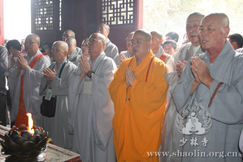 会谈结束后,永信法师和全南亭团长在少林寺大雄宝殿共同主法,为人类幸福安康、世界和平安宁诵经祈福。