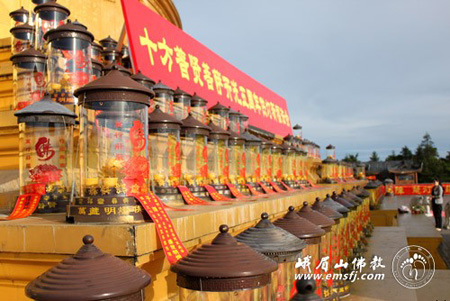 2011年6月18日晚,四川峨眉山金顶华藏寺十方普贤菩萨像前隆重举行了十方普贤菩萨开光五周年供灯祈福法会。来自各地法师、居士、信众三百多人参加了此次法会。